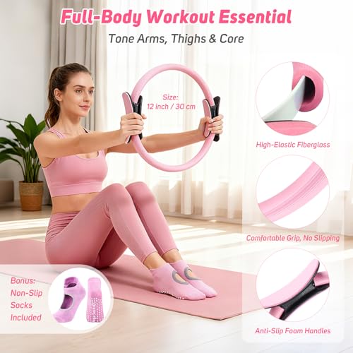 【All-in-One Pilates Set】This 14-piece Pilates essentials kit for women includes a Pilates ring, 4 resistance bands (15–50 lbs), yoga ball with pump, sliding discs, foam roller, pull rope, stretch band, figure-8 band, non-slip socks, and a carry bag. Everything you need for home gym workouts, core strengthening, and full-body toning.