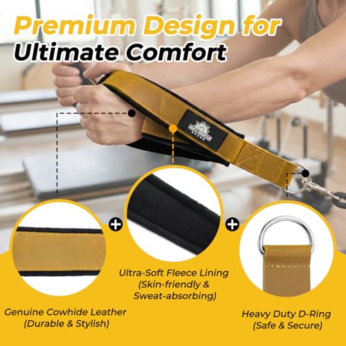 ✅ Genuine Cowhide Leather Durability: Made with high-quality genuine cowhide leather, these straps resist wear and tear even with daily use, offering a luxurious feel that outlasts synthetic alternatives. The leather surface provides subtle grip without slipping, ensuring secure movements during reformer workouts.