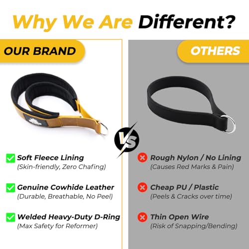 【Genuine Cowhide Leather + Ultra-Soft Fleece Lining】 Crafted with premium genuine cowhide leather for long-lasting durability and a sleek, professional look, our straps feature an ultra-soft stitched fleece lining that eliminates friction, prevents skin irritation, and keeps you comfortable through hours of Pilates reformer sessions.